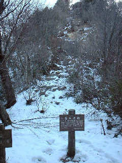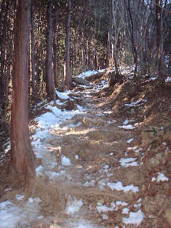 正丸駅を出てしばらくは左に右に小さな滝が続く清流を見ながら集落の中を歩いていきます。ここの道は林道で舗装もされているので歩きやすいです。途中駅から20分ほどのところに「中丸屋」というところは手打ちうどんの看板がありましたが、その日はお休みでした。そして安産祈願の地蔵堂を過ぎ30分ほどで「馬頭観音」に着きます。林道とはここでお別れであとは山道を歩くことになるのです。しかしこのコース全体でそうなのですが、一部は丸太の階段があったり道らしきものがあるのですが、看板なども少なく初めての人には分かりにくく非常に不安でした。そして五輪山を目指すのですがこれが結構急な斜面があったりしてきつかったです。よく遠足で来れるよなあ・・・。そして雪が残っていてカチカチに凍っているので滑って危険でした。先に行った老夫婦の方々はこのところでひき返していましたよ。