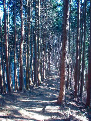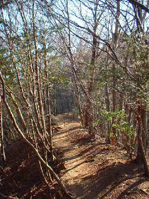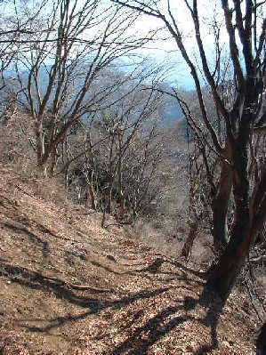 お昼を食べて伊豆ケ岳を下り始めます。それ以降の道は雪もなく日差しがあって大分雰囲気も変わります。でも所々雪も残り油断できません。またそういう雪の上の足跡が道しるべにもなるのです。しかし尾根伝いの楽な道と思っていたのが甘かった。写真ではなだらかなところばかりですが、結構急な斜面もあり登ったと思ったら下りたりの結構体力がいるコースでした。そして距離が長いのでペース配分に要注意です。ほとんどがこの間は植林に視界がさえぎられているので眺めは期待できませんよ。ひたすら足元の悪いアップダウンが続きます。\(*⌒0⌒)bがんばっ♪天目指峠の手前でやっとコース半分確認!