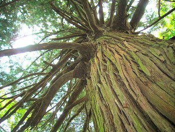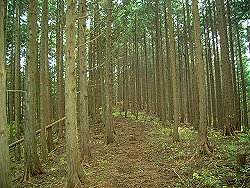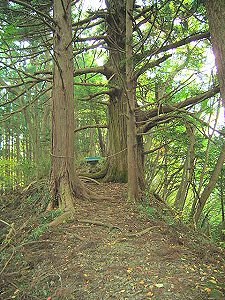 ようやくルートに戻り、しばし登り坂が続きます。登り道が終わる頃に右手に小さな祠が見えます。脇には恐らく御神木なのでしょう。直径2m近くもありそうな杉の大木が立っていました。何十年も何百年もこの場所に立っている巨木はおろかな人間をどう見てきたのでしょうか。