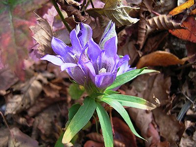 道端には菊の一種でしょうか?白い小さな花や名前不明の赤い実がなっていました。連行峰には11時過ぎに到着しました。樹木に遮られて見通しはあまり良くない場所ですが、ここからは東西に伸びた日当たりのいい尾根道が続きます。ただ天気はいいのですが霧が多くて見晴らしは良くなくてちょっと心配になってきました。三国峠に着くまでに霧が晴れることを祈って出発です。