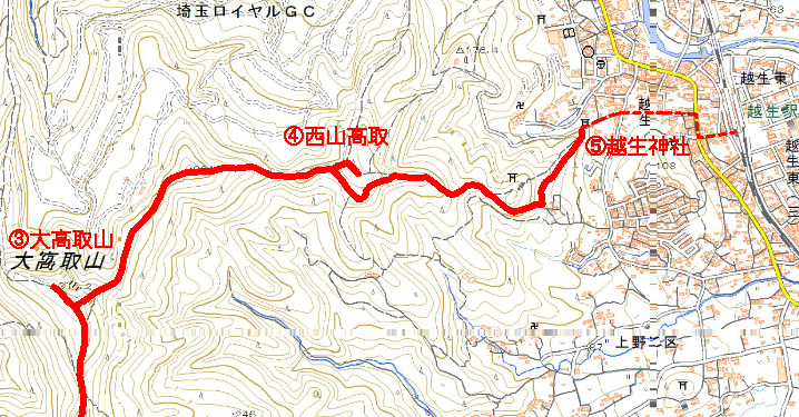 久しぶりに山歩きに出かけました。 比較的負荷の軽い行程と思い、奥武蔵の大高取山にしました。 交通はJR八高線または東武越生線の越生駅からとなります。越生駅からバスで上大満というところまで行き、そこから越生の駅までは合計約7km程の行程です。 ①上大満~②桂木弁天:2.8km ②桂木弁天~③大高取山:1.1km ③大高取山~④西山高取:1.3km ④西山高取~⑤越生神社:1.2km (越生神社~越生駅:0.6km) 上の距離はcadで測定したものですので、合っているかは解りませんが、ゆっくり歩いても3~4時間で簡単に歩けるコースです。 |