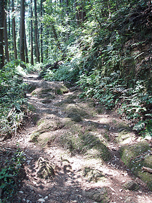 宿谷の滝の石階段の降り口付近から車道に抜ける(鎌北湖方面)階段がありますので登って車道に出ます。右に出て200m程のところを左側に入ります。坂道になっている途中から折り返すように鎌北湖方向の道が分岐します。途中何カ所か分岐がありますが、標識があまりなかったように思うので地図を確認して間違わないように注意してください。やがて鎌北湖に近くなってくると道も整備された感じになってきて鎌北湖の駐車場のはずれに到着です。宿谷の滝へは県道側から行く人がほとんどだと思いますが、このようなルートも良いと思います。ただ結構な急斜面がありますので、サンダルとかでは無理です。念のため。 |