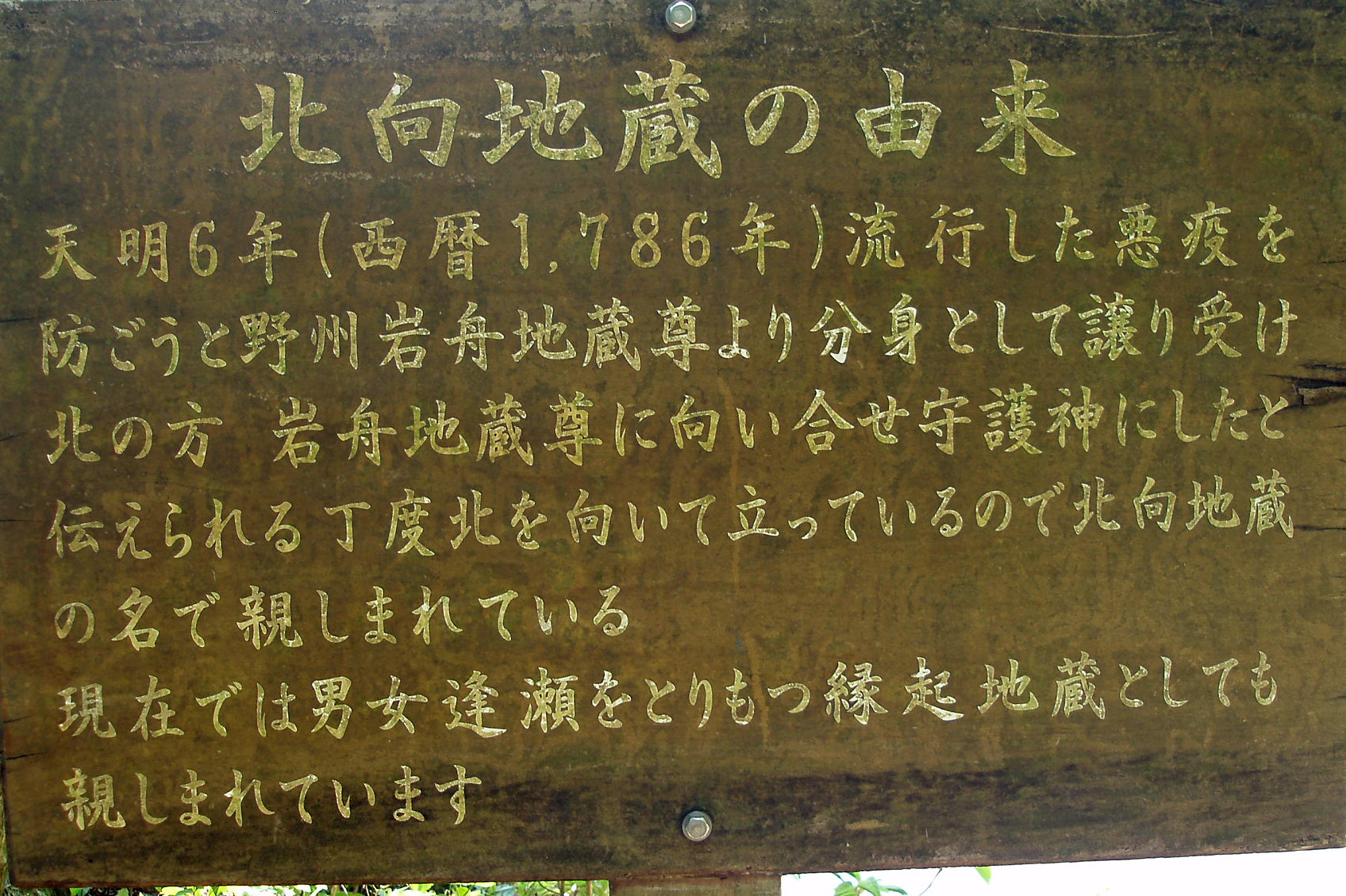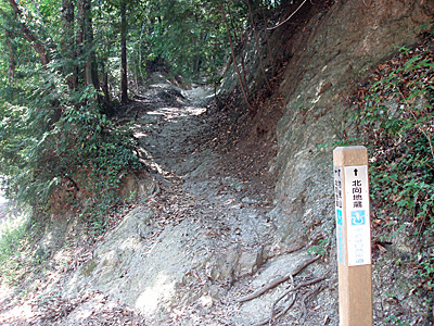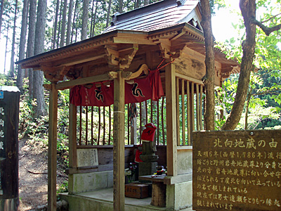 途中、舗装された車道に出ますが、ここは右に行きます。すぐの交差点はまっすぐ坂道方向に向かいます。写真を撮り損ねましたが右側に開けて眺めが良い個所です。再び林の中の道をしばらく行くと舗装された道に出ます。その脇に「北向き地蔵」があります。小さなお堂と釣鐘があります。北を向いているので「北向き」だそうです。車道に面しているので自転車族やドライブ族も集まっています。 |
