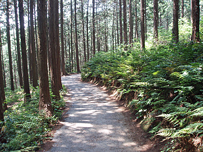 | 北向き地蔵からほどなく、一旦車道に出ます。物見山までは高低差も少なく歩きやすい道です。 |