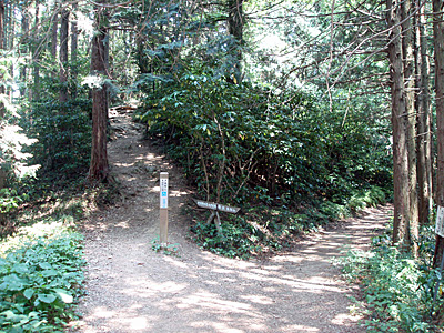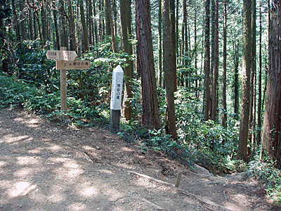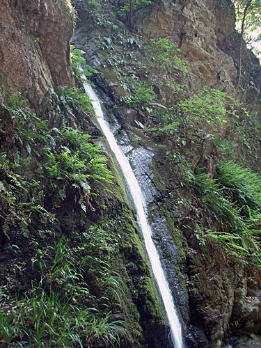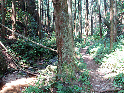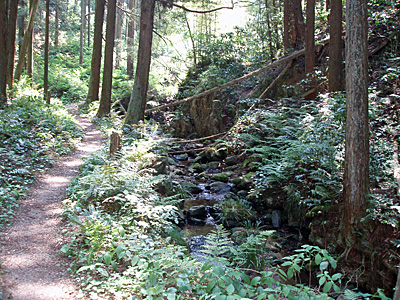 | 物見山から少し戻ると宿谷の滝への分岐があります。結構な急斜面が続く箇所もありますので注意が必要です。 | 急斜面を下りきると沢が現れます。 | |||