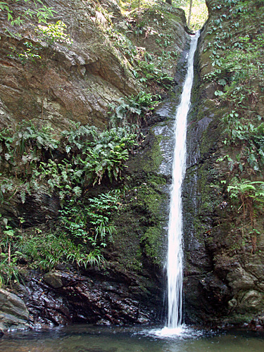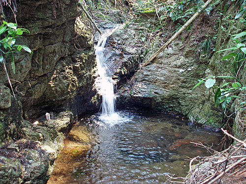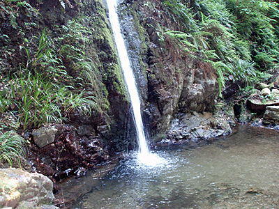 | 上流は自然な感じが残っています。 | やがて右手に小さな「小滝」が現れます。パワースポットと書いた真新しい看板が立っています。 |