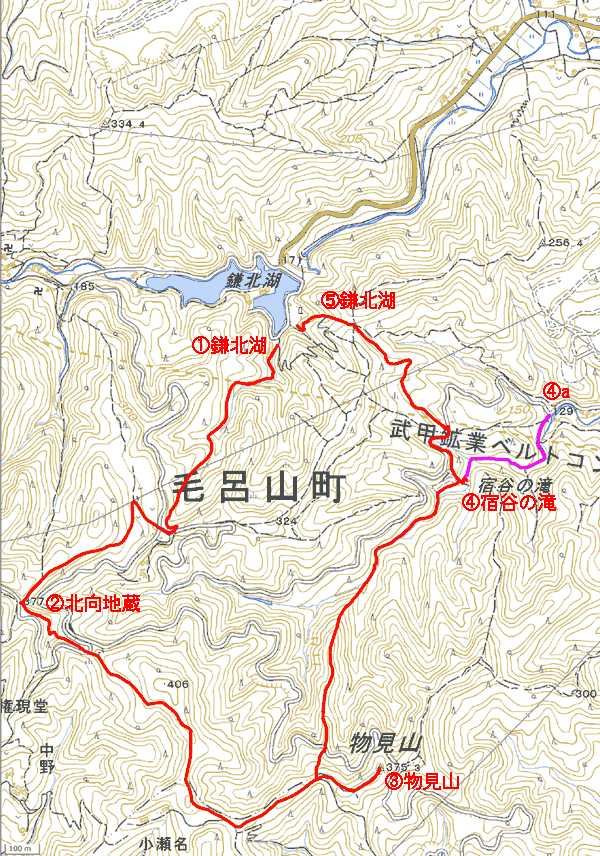 奥武蔵の物見山と宿谷の滝に出かけました。 交通はJR八高線毛呂駅または東武越生線の東毛呂駅からとなります。駅からは結構な距離がありますが、元気な人ならば途中の経路も楽しみながらで良いのではないでしょうか?なお、現在のところ平日のみですが毛呂山町の「もろバス」が本数が少ないですが毛呂駅付近から鎌北湖間の運行があります。 ①鎌北湖~②北向地蔵:1.4km ②北向地蔵~③物見山:1.5km ③物見山~④宿谷の滝:1.3km ④宿谷の滝~⑤鎌北湖:1.0km ※上の距離はcadで測定したものです。 ゆっくり歩いても3~4時間で簡単に歩けるコースです。 |