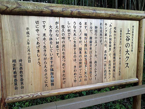 越生町上谷(かみやつ)にある巨大な楠の木です。 越生駅からだと越生梅林を超え急坂を登ったところにあります。木の周りにはウッドデッキが組まれていて整備されています。 全国巨木ランキング:16位 埼玉県巨木ランキング:1位 現地案内表示板 |
