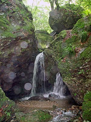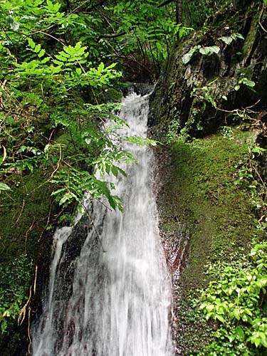 | 姥樫から更に道標にあるカツラの巨木に行ってみます。途中道のそばに小さな滝がありました。周りには表示板など無いようですが、「姥樫の滝」と思われます。 |