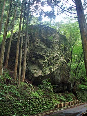 | 山道から元来た道に戻ります。坂道を必死にペダルを漕ぐ。大きな石だ。 | 鳴岩の滝に着いた。この先で舗装道は終了。 |