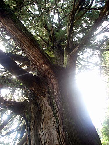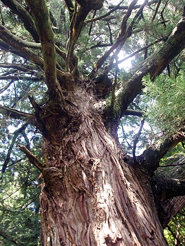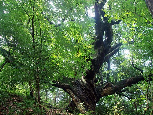 | 再び道標にそって「カツラ」の巨木を目指す。いい加減山道を登ったところでようやく到着。幹周りは3.0mある。木の周りは足場が悪く近づくのは大変そうだ。 |
