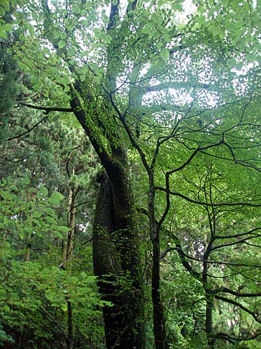 | 川(泉川)に沿った道から木橋を渡り山道に入る。チャリは流石に厳しいので徒歩でしばし歩く。道標に導かれて「姥樫」に着いた。幹周り6.58mのアカガシの巨木は幹が大きく捻くれている。 |