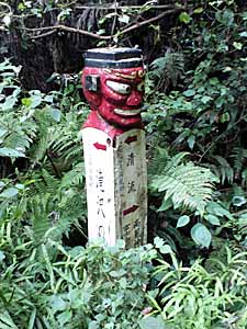 | 山道を降りると小川の脇に小道がある。トーテムポール?の道標 |