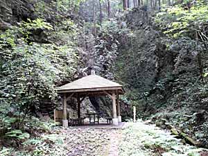 | 滝の入口は小屋があって少しわかりづらいかもしれません。鎌北湖方面には徒歩で山道を抜けることが出来ます。 |