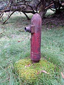 | ひとしきり登ると廃村らしきものが現れます。少々薄気味悪いです。遠くに石灰岩の山肌が見えます | 廃村には消火栓も残ってました。 |