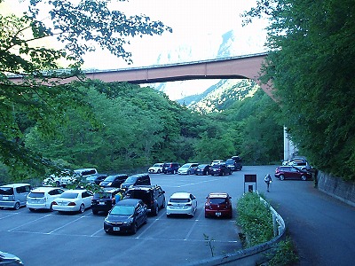 西沢渓谷無料駐車場 後ろは国道140号の西沢大橋(でかい) |