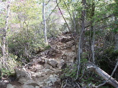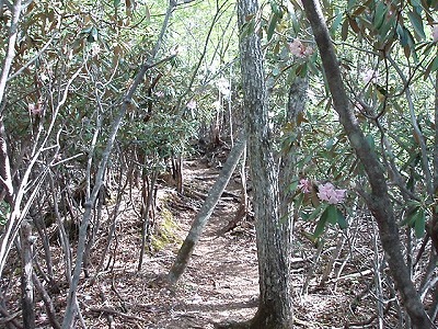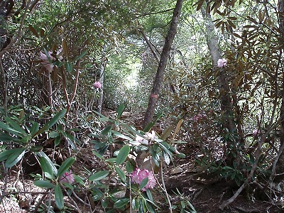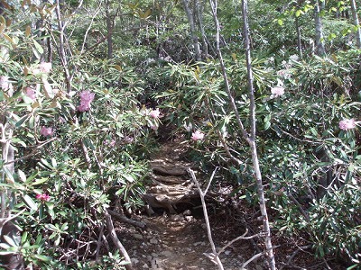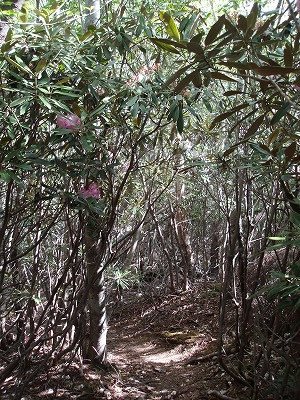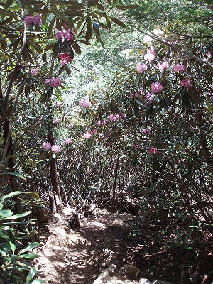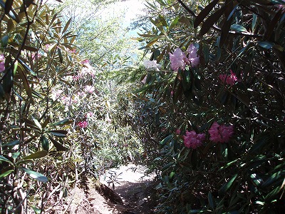 | 石がゴロゴロ | シャクナゲのトンネルが続く |