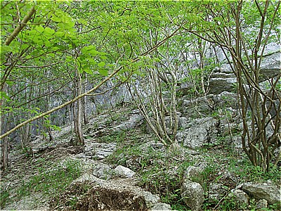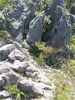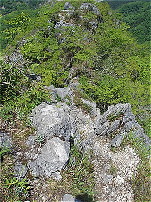 | 岩場に金具が残ってるこれがローソク岩か? | この先少し登って行き止まりと思われ戻った |