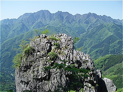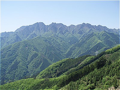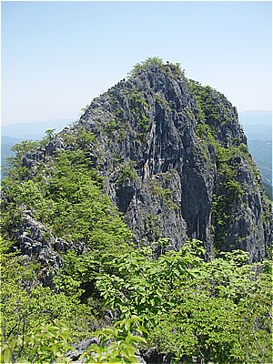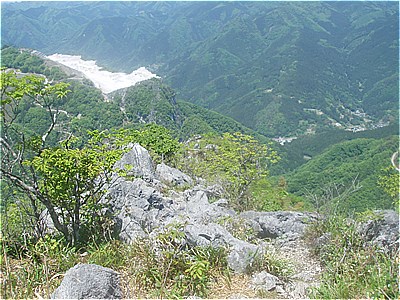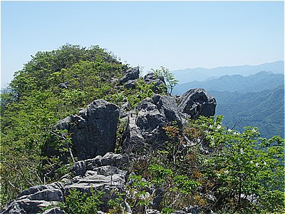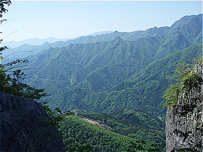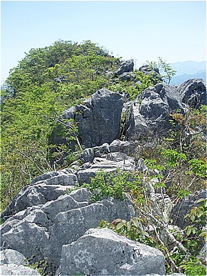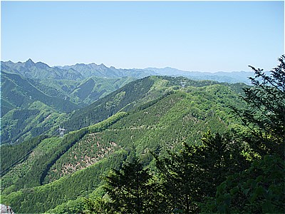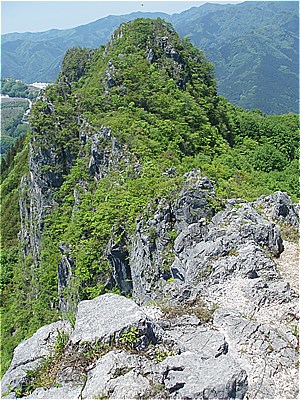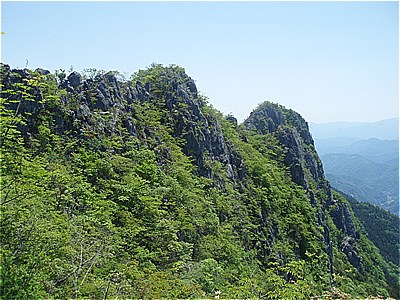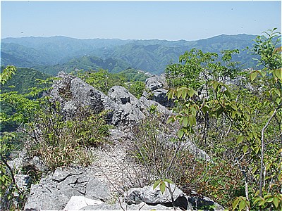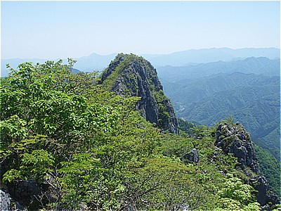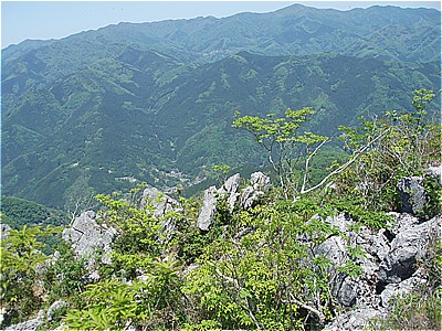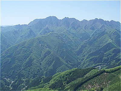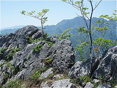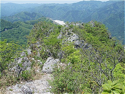 | 西岳の西端の尾根に上がった | 西には石灰岩採掘で白く無残な叶山 |