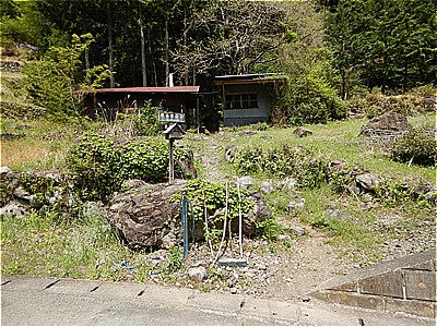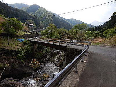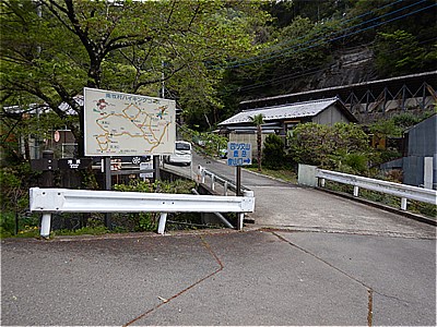 | 橋を渡ると大久保の集落です | 集落の中程に鹿岳登山口の案内 |