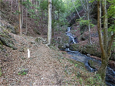 | 四ツ又山登山口 7:55 車はここまで入れる | 沢に沿って進む |