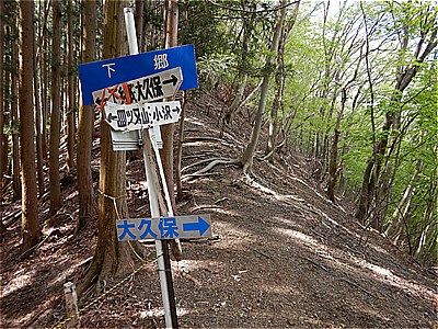 右の大久保方面から登ってきた 8:26 複雑な分岐 奥側は下郷と小沢 手前が四ツ又山 |