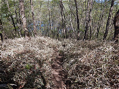 | 日陰が殆どない山頂でかろうじて日陰を確保して昼休み | ひたすら榛名湖に向けて下っていく |