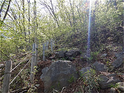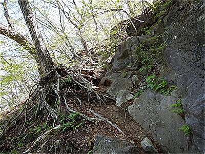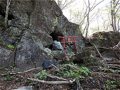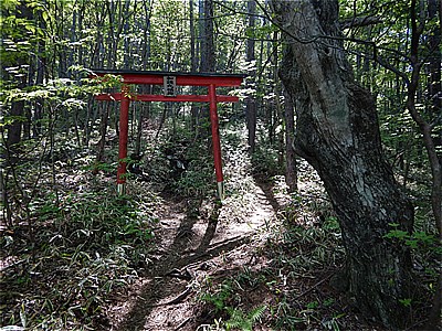 | 鳥居をくぐる | ロープの手すりのあるやや急でガレたとこを登る |