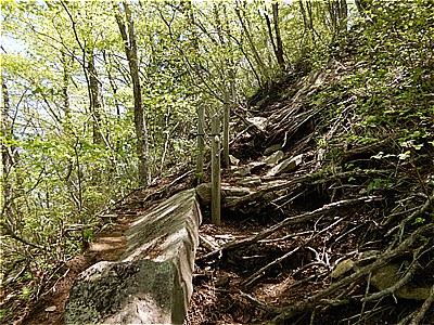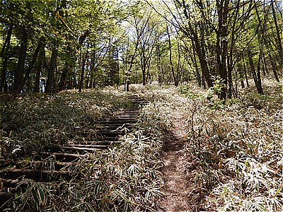 | 先程の分岐に戻り掃部ヶ岳に向かう | 木の階段が長く続く 当日の前橋の最高気温は33度 |