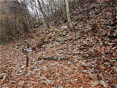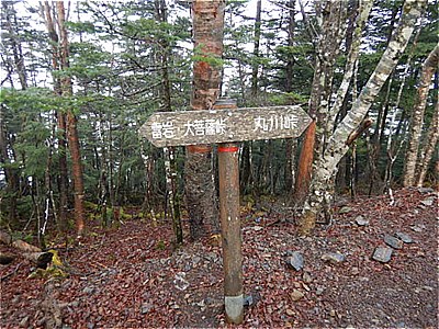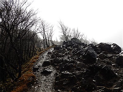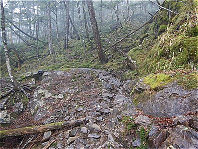 | 雷岩に着いた 9:35 上日川峠に分岐 | この辺りからガレ岩がゴロゴロしています |
