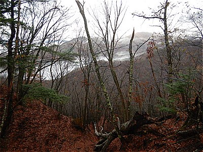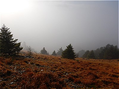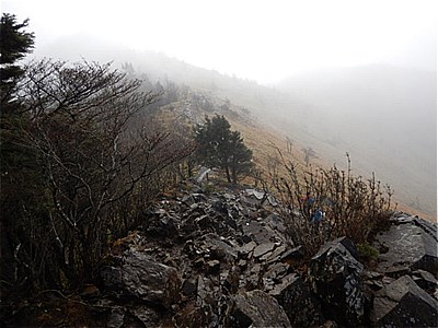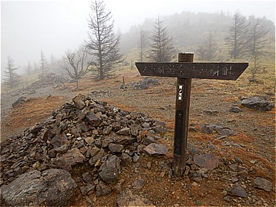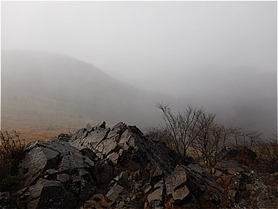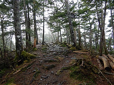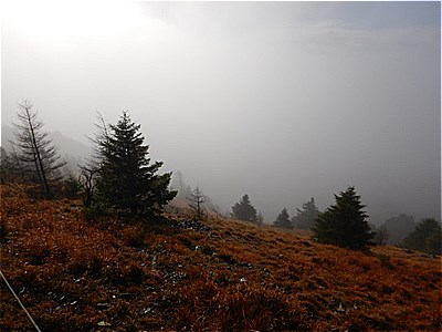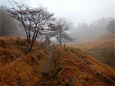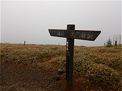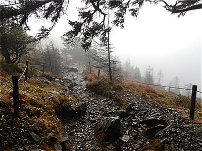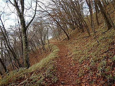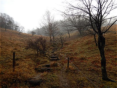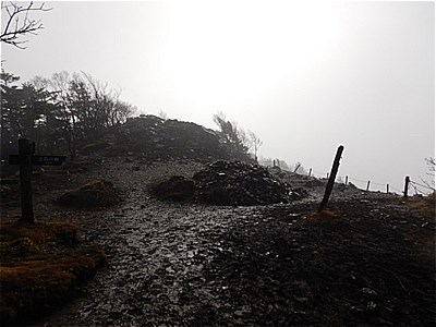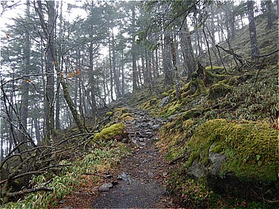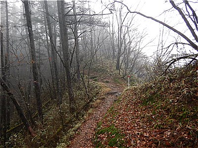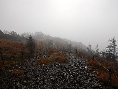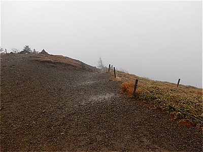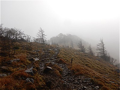 | そんなに急ではないがひたすら上りが続く | 霧で眺望は望めない。雲海のようになってる。 |
