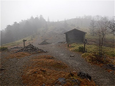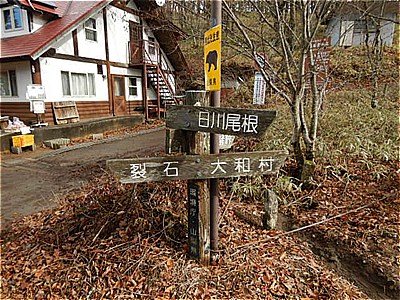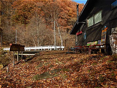 | 突然開けた場所に出た | 賑やかな人声とストーブの煙の出てる山荘の右に進む |