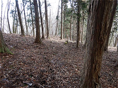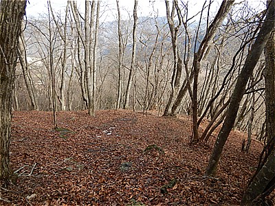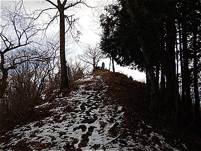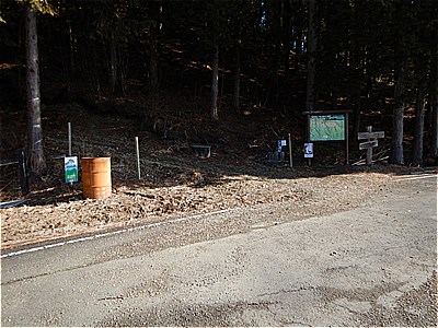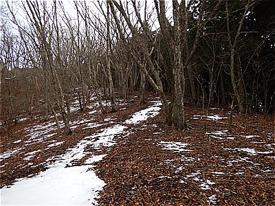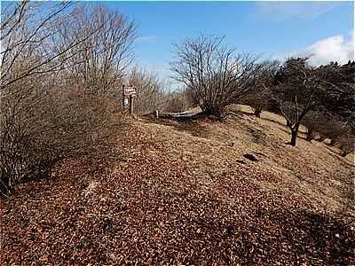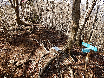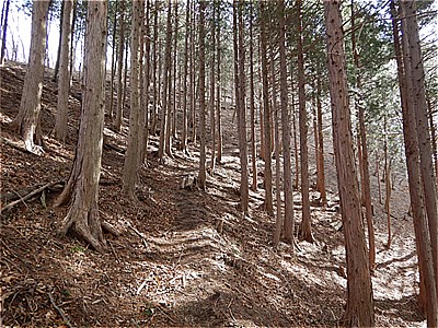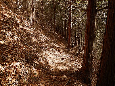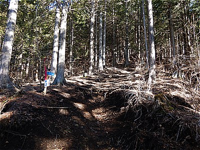 | 人工林の影の平坦な道が続く | ここの標識のとこで尾根筋に出る |