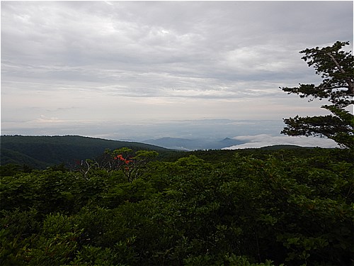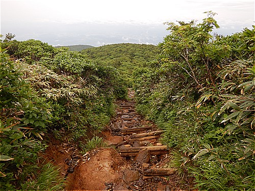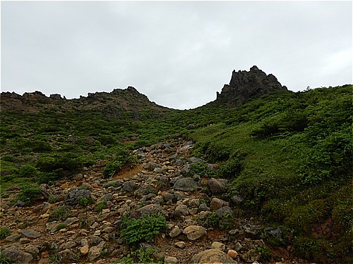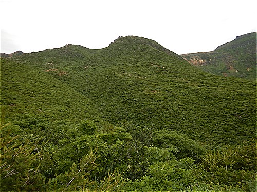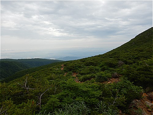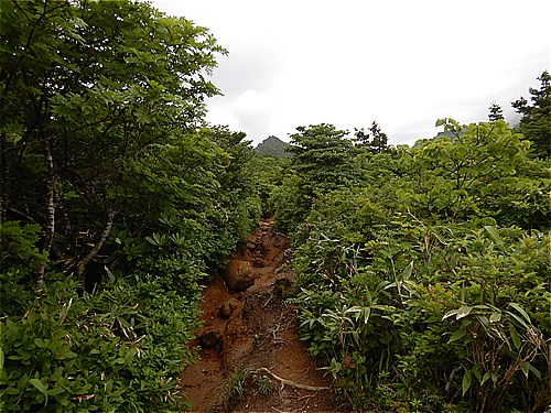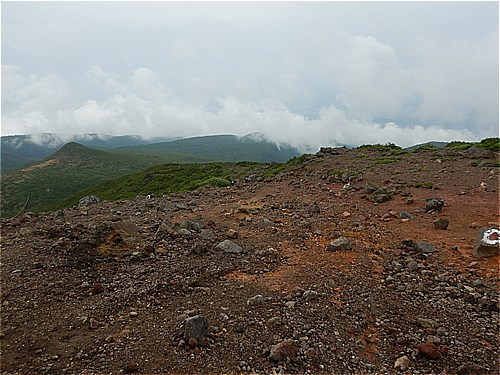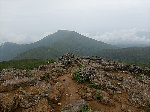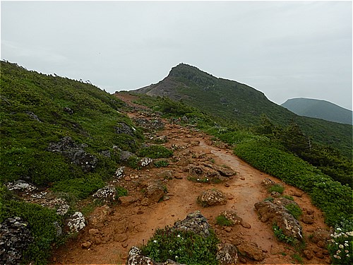 鉄山で少し休んで再び沼ノ平を横目にもと来た道を戻る 奥の山は磐梯山かな? |