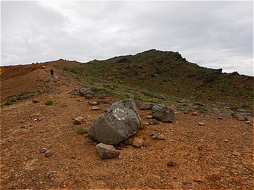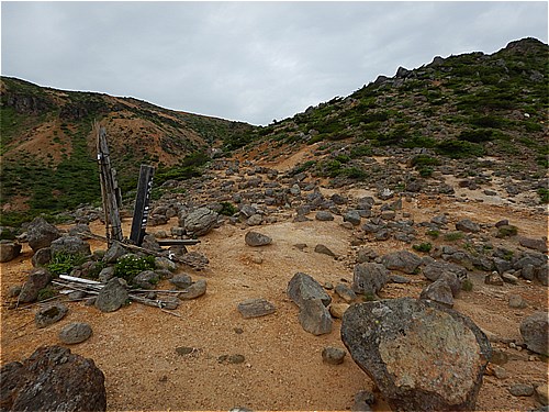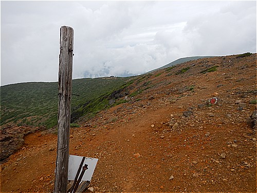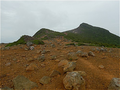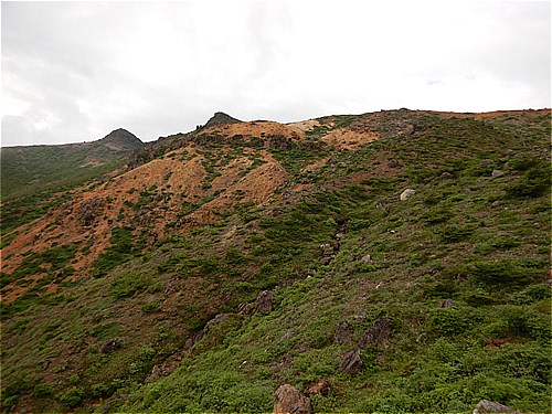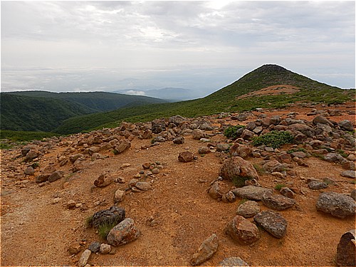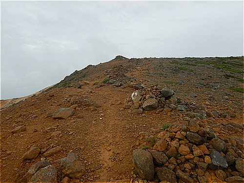 | 8:54 峰の辻に着いた | 硫黄の影響?で赤茶色の岩がゴロゴロしてる |