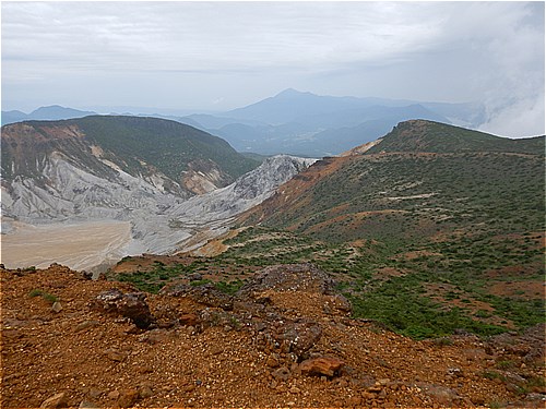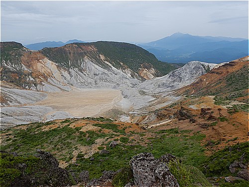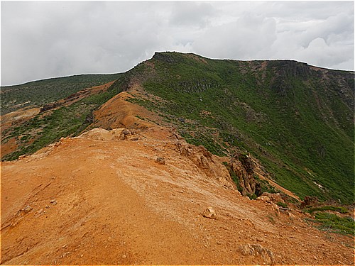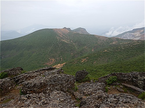 左手に沼ノ平の火口が見えます 沼ノ平は1900年に噴火で死者72名1997年にはガスで4名が死亡しています |