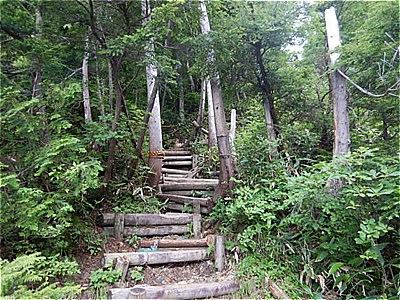| 5:46 金精峠駐車場 | キツイ木の階段が続く |