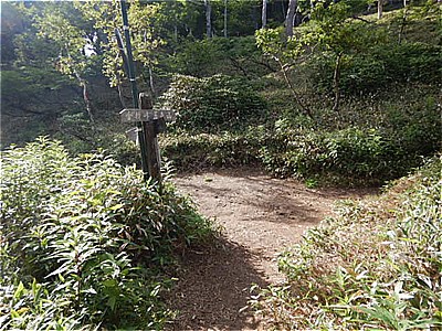 | 6:07 金精峠に着いた 菅沼方面分岐 | 峠の祠の左を抜けて進む |