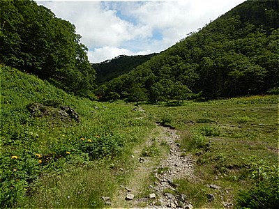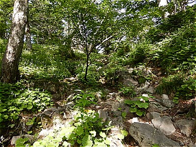 | よく見た黄色いこの花はマルバダケブキかな? | 岩がゴロゴロの斜面を下っていく |