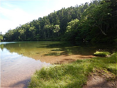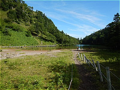 8:18 弥陀ヶ池(みだがいけ)に着いた この手前で犬のような凄い唸り声を聞いた。熊かと思ってそーっと通り過ぎたが、あとから聞いた話だとやはり子連れの熊だったらしい |