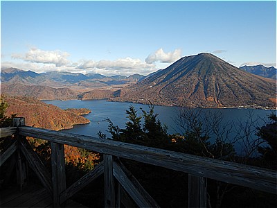 | 木のデッキから絵葉書のような男体山と中禅寺湖が見える |