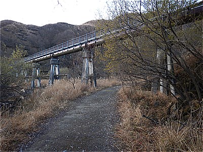 | しばし工事用道路を歩いて次に左方向の松木川を渡る | パイプラインのようなものの下をくぐる |