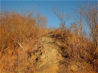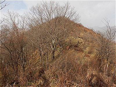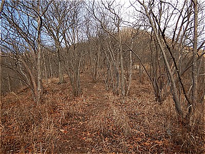 | 尾根に出ると踏み跡が現れた | 狭くて急な尾根を登る |
