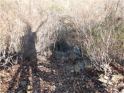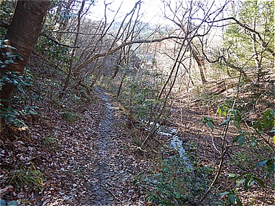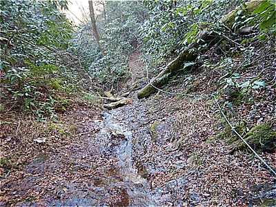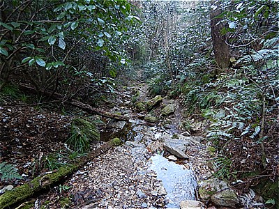 | ロープの張ってある沢を下る | 沢に沿って進む |