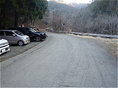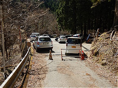 11:17 登山口の駐車場に着いた 駐車場はすでに一杯それでも次から次に車がやって来る ここの手前の県道はすれ違いできないので注意 |