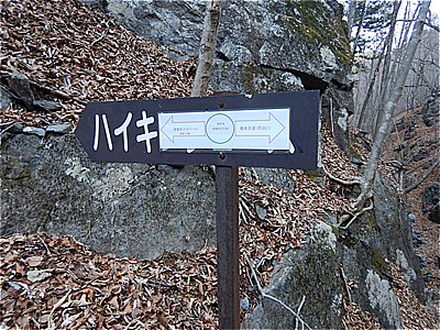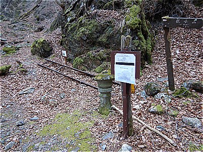 7:05 炭焼かまど跡 左は高巻きトラバースとある 右の根本古道(沢コース)へ進む |