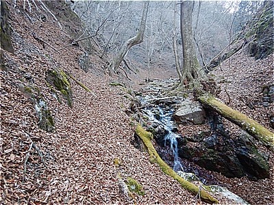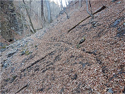| 沢を何度も渡り斜面の足場の悪い道を進む | こんな感じのやや不明瞭な道 |