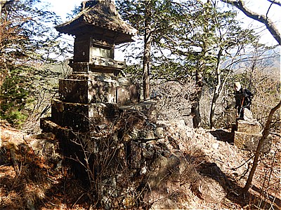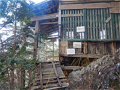 | 7:57 根本山神社本社に着いた | 岩場の上にあり今にも崩壊しそうな社 |