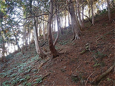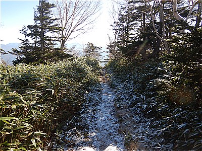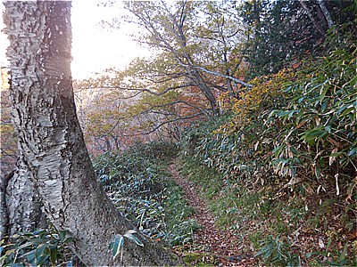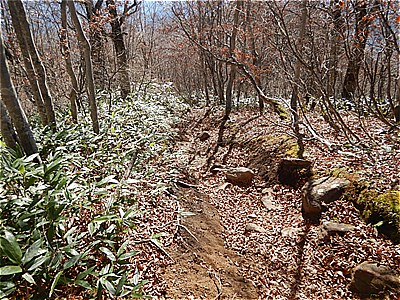 | 小さな沢を渡り斜面を登っていく | 6:51 左からくる旭小屋登山口からの道と合流 |
