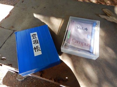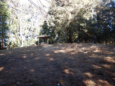 | 左からは先ほどの鳥居の隣の入り口への道 | 東屋には登頂帳がある |